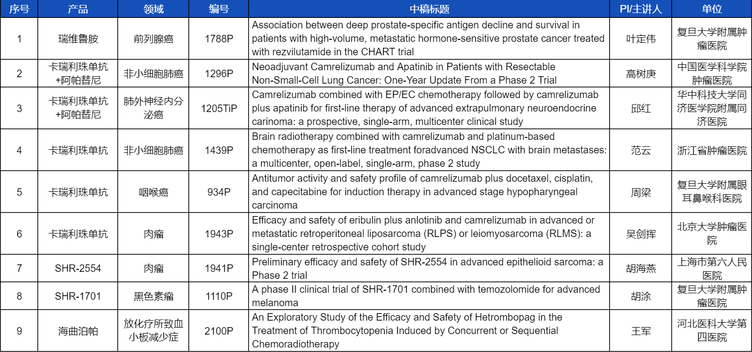 在非小细胞肺癌、咽喉癌、肉瘤、前列腺癌、黑色素瘤等多个领域,卡瑞利珠单抗、阿帕替尼、瑞维鲁胺、SHR-1701、SHR2554等创新产品相关研究一共入选了8项壁报展示。此外,AG百家乐官网医药自主研发的血小板生成素受体激动剂(TPO-RA)海曲泊帕在放化疗所致血小板减少领域的探索性研究显示良好的疗效,入选壁报展示。